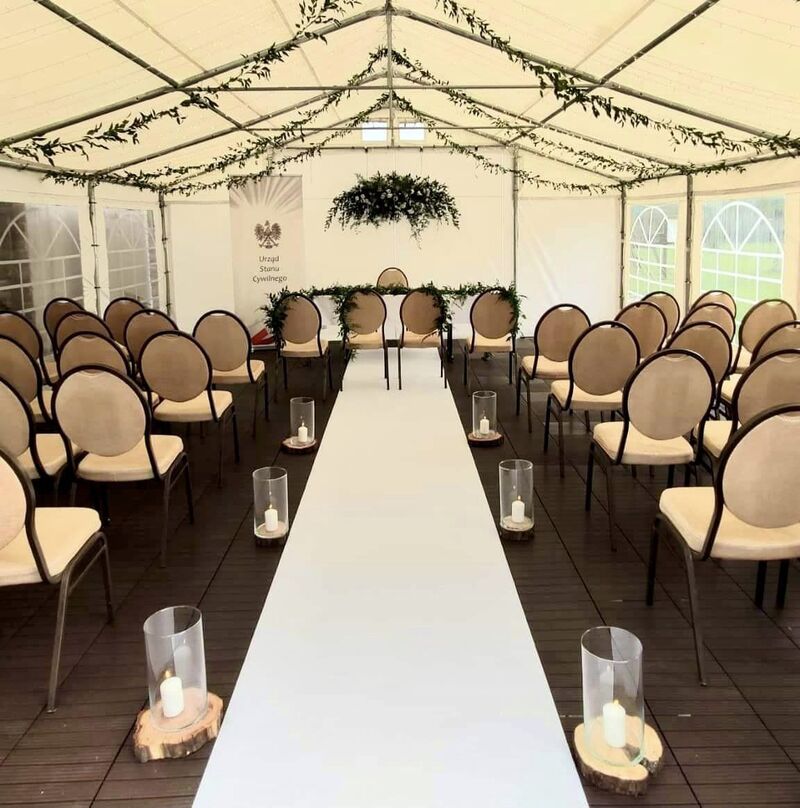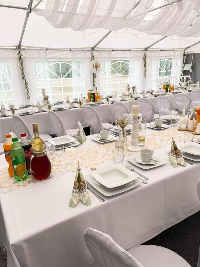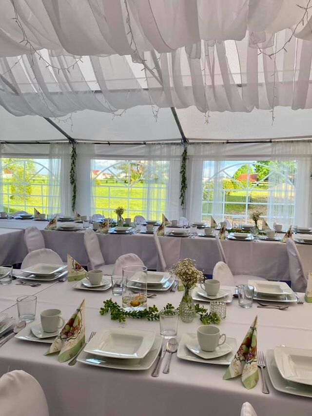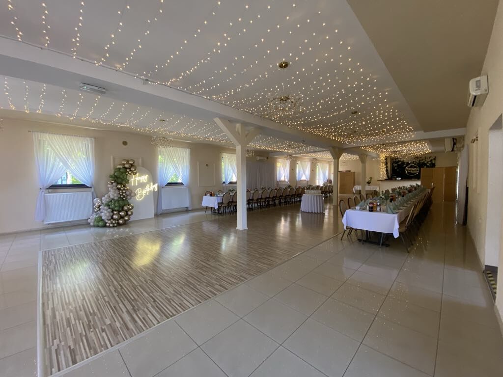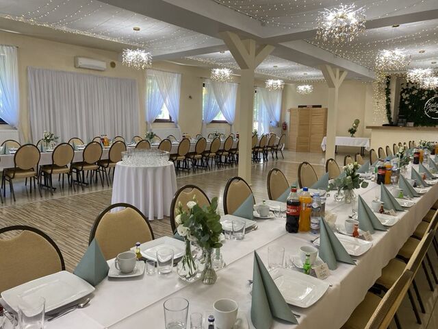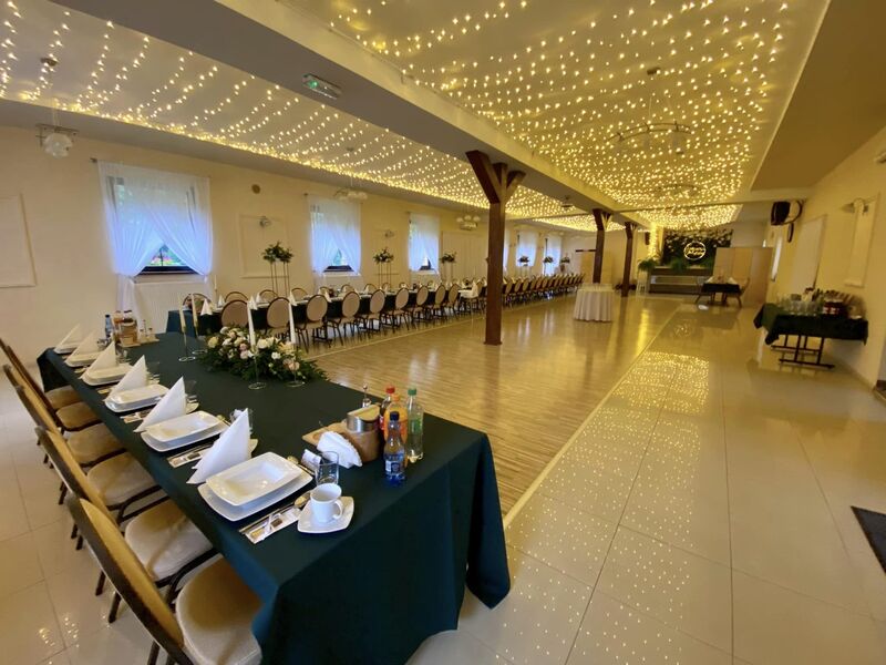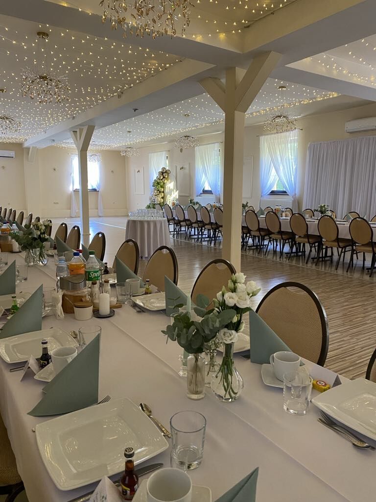 Oferujemy organizację przyjęć zarówno w sali, jak i w namiocie, a także imprez plenerowych, w tym grill.